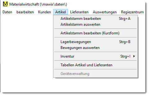 | Mit der Menüauswahl Artikel werden alle den Artikelstamm betreffenden Programmfunktionen aufgerufen. Die Funktionen für die Bearbeitung des Artikelstamms und der Lagerbuchhaltung können auch über das Regiezentrum aktiviert werden. |