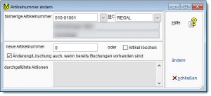 Artikelnummer ändern/Löschen Eine einmal geänderte Artikelnummer kann an dieser Stelle nachträglich geändert werden, auch wenn bereits Lagerbewegungen und Kundenaufträge stattgefunden haben. Die komplette Historie wird mit geändert.
