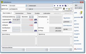 | Hier erfolgt die Datenpflege für den Artikelstamm. Die Artikeldaten stehen auf verschiedenen Registerseiten und in mehreren Folgemasken. Der Aufruf des Artikelstamms erfolgt über das Menüsystem (Auswahl ARTIKEL) oder das Regiezentrum. Für die schnelle Erfassung einer großen Zahl von Artikeln gibt es noch eine spezielle Erfassungsmaske (Artikelstamm – Kurzform). |