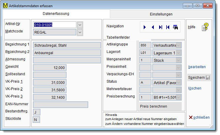 Zur Eingabe eines neuen Artikels ist einfach eine neue Artikelnummer einzugeben, zum Ändern eines Artikels ist eine vorhandene Artikelnummer einzugeben.