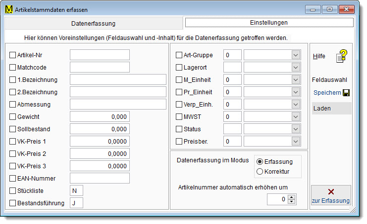Der Aufruf erfolgt über Aufruf: Menü ARTIKEL – ARTIKEL ERFASSEN Register DATENERFASSUNG