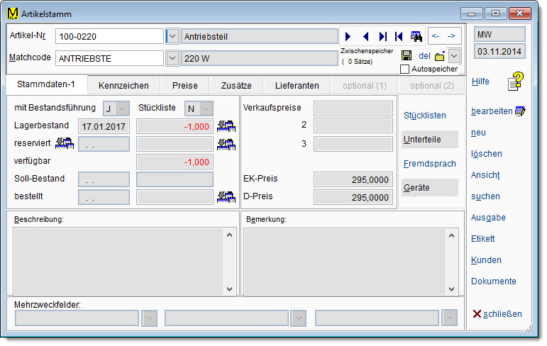 (Matchcode) „MC“ Ein Artikelstamm kann auch über den Matchcode aufgerufen werden. Wenn die Eingabe nicht zu einem eindeutigen Ergebnis führt, werden alle zutreffenden Artikel zur Auswahl angeboten.