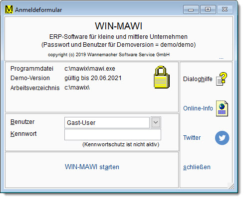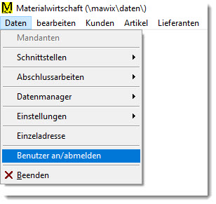 Benutzer an/abmelden Die Programmfunktion Benutzer an-/abmelden im Menü Daten entspricht der Startmaske von WIN-MAWI.