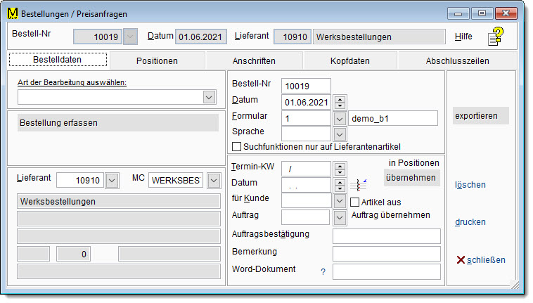 Der Aufruf erfolgt über Menü LIEFERANTEN – BESTELLUNGEN oder an verschiedene Stellen im Regiezentrum.
