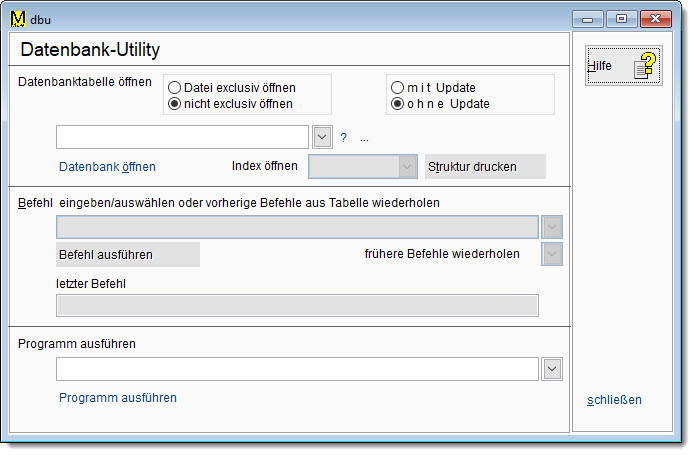 Dieses Funktion sollte nur von erfahrenen Anwendern oder in Absprache mit dem Hotline-Service eingesetzt werden. Es kann mit speziellen Befehlen direkt auf die Datenbanken zugegriffen werden. Es können auch vor kompilierte Programme ausgeführt werden.