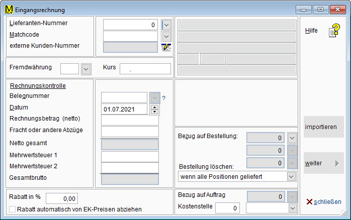 Damit wird es ermöglicht, die Erfassung mit den auf der Rechnung ausgewiesenen Preisen vorzunehmen und trotzdem die tatasächlich gezahlten Preise in die Materialwirtschaft einfliessen zu lassen.