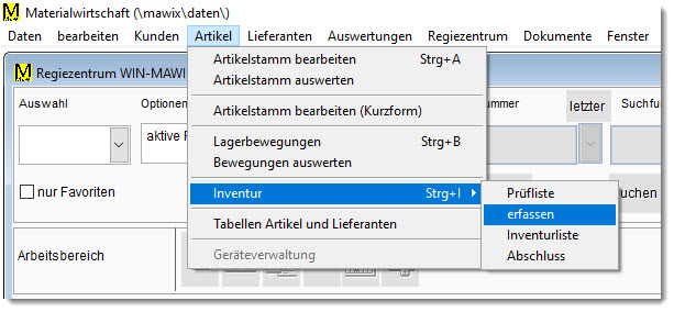 Der Aufruf der Erfassung erfolgt über Menü ARTIKEL – INVENTUR – ERFASSEN