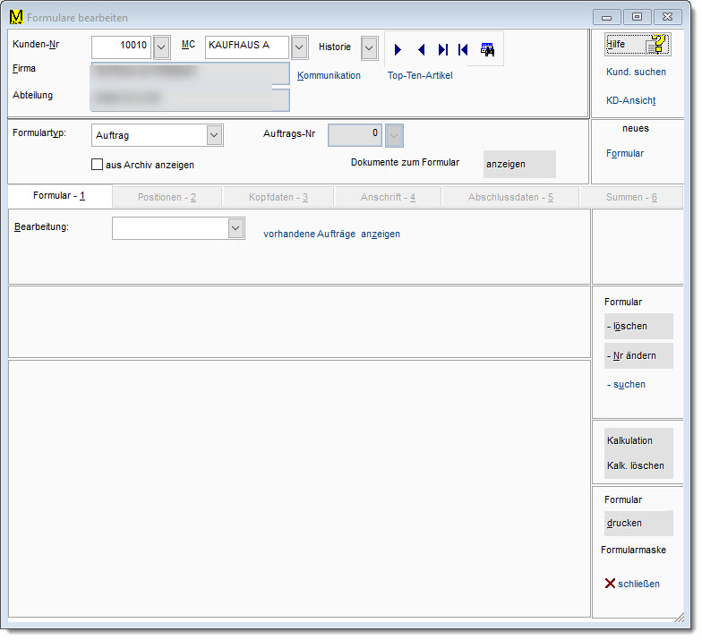 - Auswahl FORMULARTYP (Angebot, Auftrag, usw. ) (Art der Bearbeitung (erfassen, ändern, Bezug auf anderes Formular -> z.B. Rechnung aus Lieferschein)