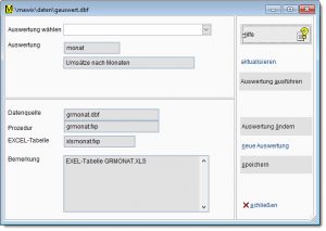 Bei den Grafische Auswertungen wird der Datenbestand mit individuell gestaltbaren Zusatzprogrammen aufbereitet und das Ergebnis in einer Exceltabelle zur weiteren Auswertung bereitgestellt.