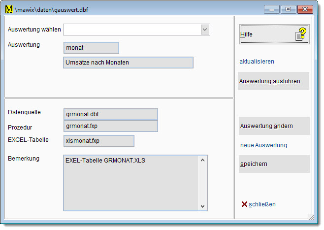 Unter VORHANDENDE AUSWERTUNG WÄHLEN kann eine bereits angelegte Auswertung