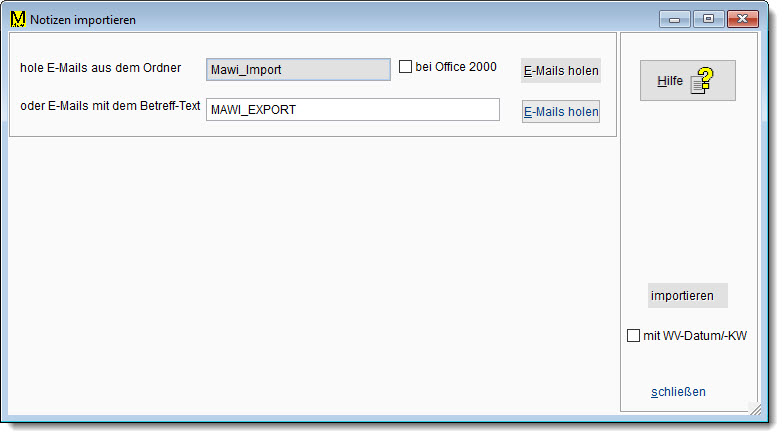 Es wird entweder ein Posteingangsordner , z.B. MAWI_IMPORT, angelegt und die eingehenden E-MAILS mit dem Betreff „MAWI_EXPORT“ werden hier automatisch abgelegt (Regel-Assistent) oder alle eingehenden E-Mails werden nach dem Betreff-Text durchsucht (MAWI_EXPORT), wenn der Regel-Assistent von MS-Outlook nicht zur Verfügung steht..