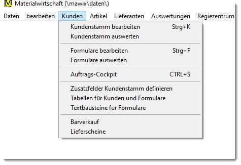 | Mit der Menüauswahl Kunden werden alle den Kundenstamm betreffenden Programmfunktionen aufgerufen. Die Funktionen für die Bearbeitung des Kundenstamms und der Formulare können auch über das Regiezentrum aktiviert werden. |
