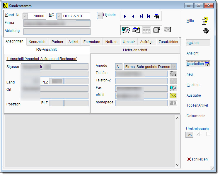 Zur Bearbeitung ist zuerst oben der gesuchte Kunde auszuwählen oder mit Button NEU ein neuer Kunde anzulegen. Die Daten können mit dem Button BEARBEITEN geändert und die Änderungen mit Button SPEICHERN in die Datenbank zurückgeschrieben werden