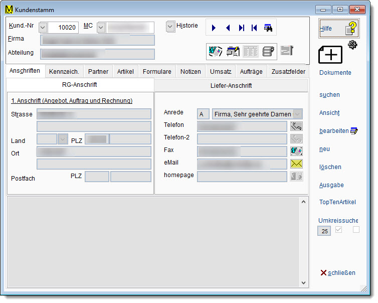 Die weiteren Angaben zum Kunden können auf den anderen Registerseiten bzw. in Folgemasken