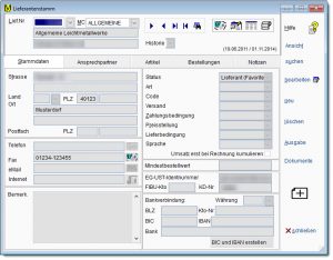 Die Stammdaten zum Lieferanten werden auf verschiedenen Registerseiten verwaltet. Der Aufruf des Kundenstamms erfolgt über das Menüsystem (Auswahl LIEFERANTEN) oder das Regiezentrum.