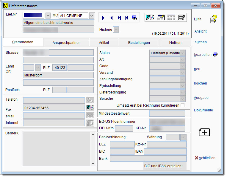 Die Stammdaten zum Lieferanten werden auf verschiedenen Registerseiten verwaltet. Der Aufruf des Kundenstamms erfolgt über das Menüsystem (Auswahl LIEFERANTEN) oder das Regiezentrum.