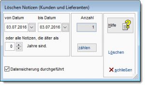 Löschen Notizen Notizen können zu Kunden und Lieferanten angelegt werden. Diese können hier nach Datum oder Alter selektiv gelöscht werden.