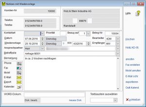 Zu einem Kundenstamm können beliebige Notizen mit einem Wiedervorlagedatum angelegt werden.