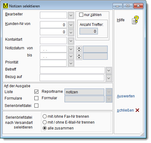 Menü KUNDEN – KUNDEN AUSWERTEN – Schaltfläche WEITER – Listenwahl NOTIZEN – Schaltfläche WEITER – Schaltfläche AUSWERTEN