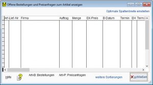 Offene Bestellungen zum Artikel Aufruf:Menü ARTIKEL – ARTIKELSTAMM Register STAMMDATEN-1 Schaltfläche BESTELLT Offene Bestellungen bei Lieferanten zum ausgewählten Artikel werden hier angezeigt.