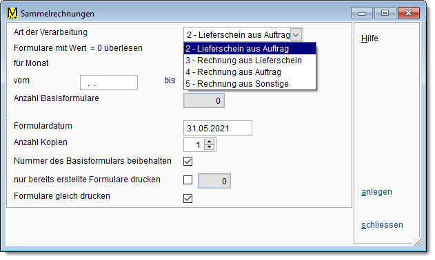 Während bei den Funktionen „Rechnung aus Lieferschein“ und „Lieferschein aus Auftrag“ die jeweiligen Basisformulare gelöscht werden, bleiben bei Bezug aus „Sonstige“ diese erhalten !