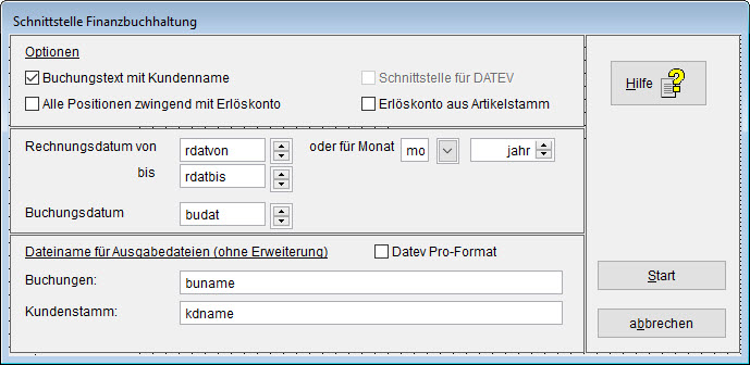 Hier ist ein Dateiname anzugeben, unter dem die Schnittstellendaten abgelegt werden. Der Dateiname ist ohne Erweiterung einzugeben, es wird immer eine .TXT-Datei angelegt.
