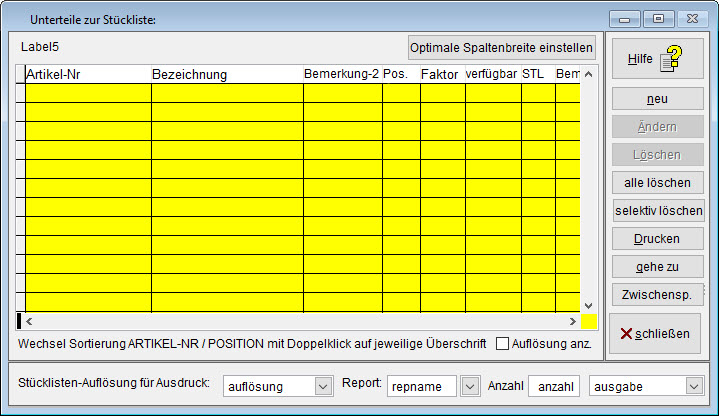 Für den Ausdruck der Stückliste werden die beiden Listenformate ARTSTLN und ARTSTLST angeboten. Es können weitere individuelle Reports erzeugt werden, diese müssen mit „ARTSTL“ beginnen !