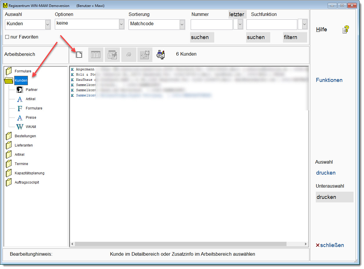 Bei Anlage über das Regiezentrum wird einfach links der Arbeitsbereich (Kunden, Lieferanten oder Artikel) ausgewählt und dann das Symbol für neuen Satz angeklickt: