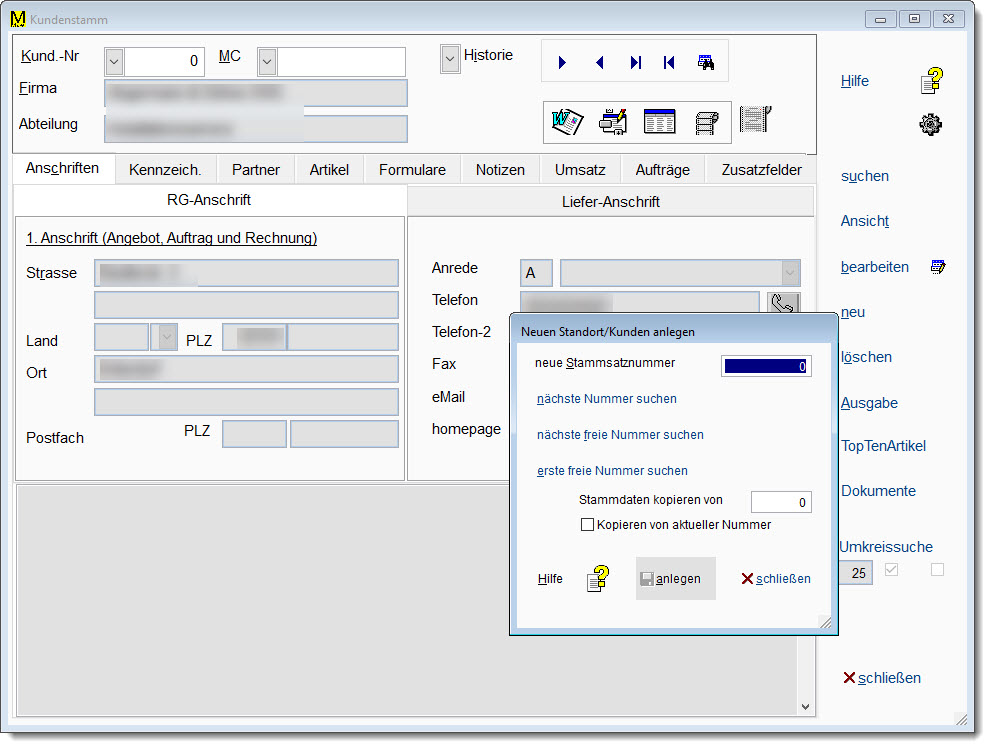 Je nach Arbeitsbereich öffnen sich dann weitere Fenster zur Festlegung der neuen Kunden-(Lieferanten-/Artikel-) Nummer und de eigentlichen Daten.