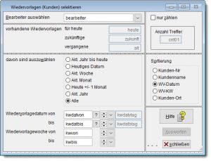 Menü KUNDEN – KUNDEN AUSWERTEN – Schaltfläche WEITER – Listenwahl WIEDERVORLAGEN – Schaltfläche WEITER