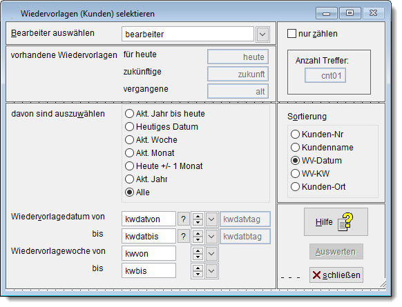 Mit „NUR ZÄHLEN“ kann vorab eine Zählung der selektierten Wiedervorlagen veranlasst werden.