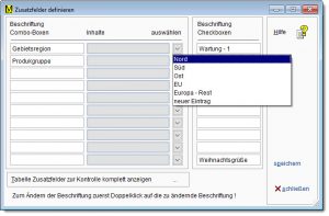 Der Inhalt der Drop-Down-Tabellen wird durch Klick auf den Pfeil und Auswahl eines der angebotenen Texte, ein neuer Eintrag erfolgt mit NEUER EINTRAG.